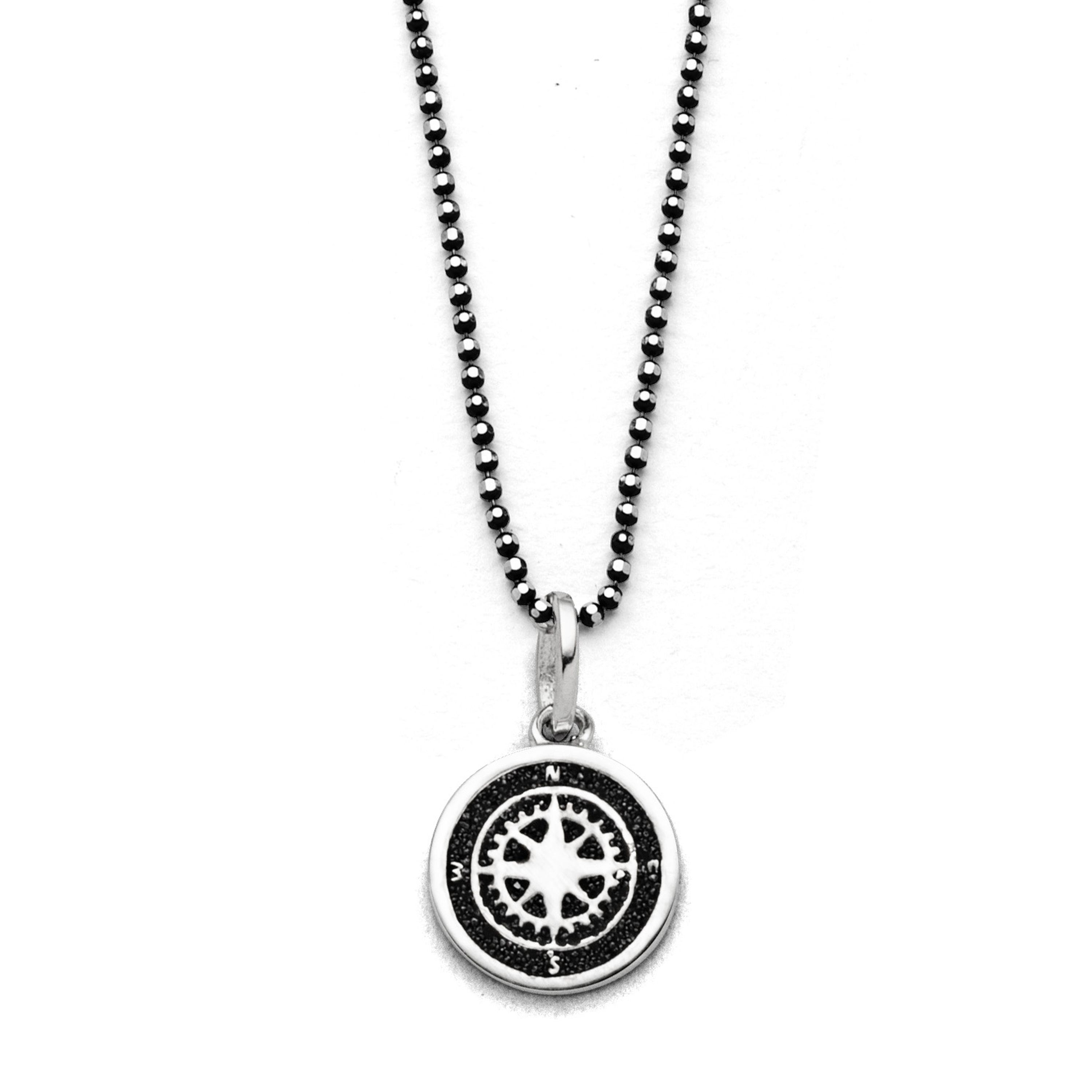 Ohrring "Kompass", kleiner runder Ohrstecker mit einer Kompassrose, innen leicht mattiert, gefaßt in rhodiniertem 925er Sterlingsilber. Durch die Rhodinierung ist das Schmuckstück anlaufgeschützt.