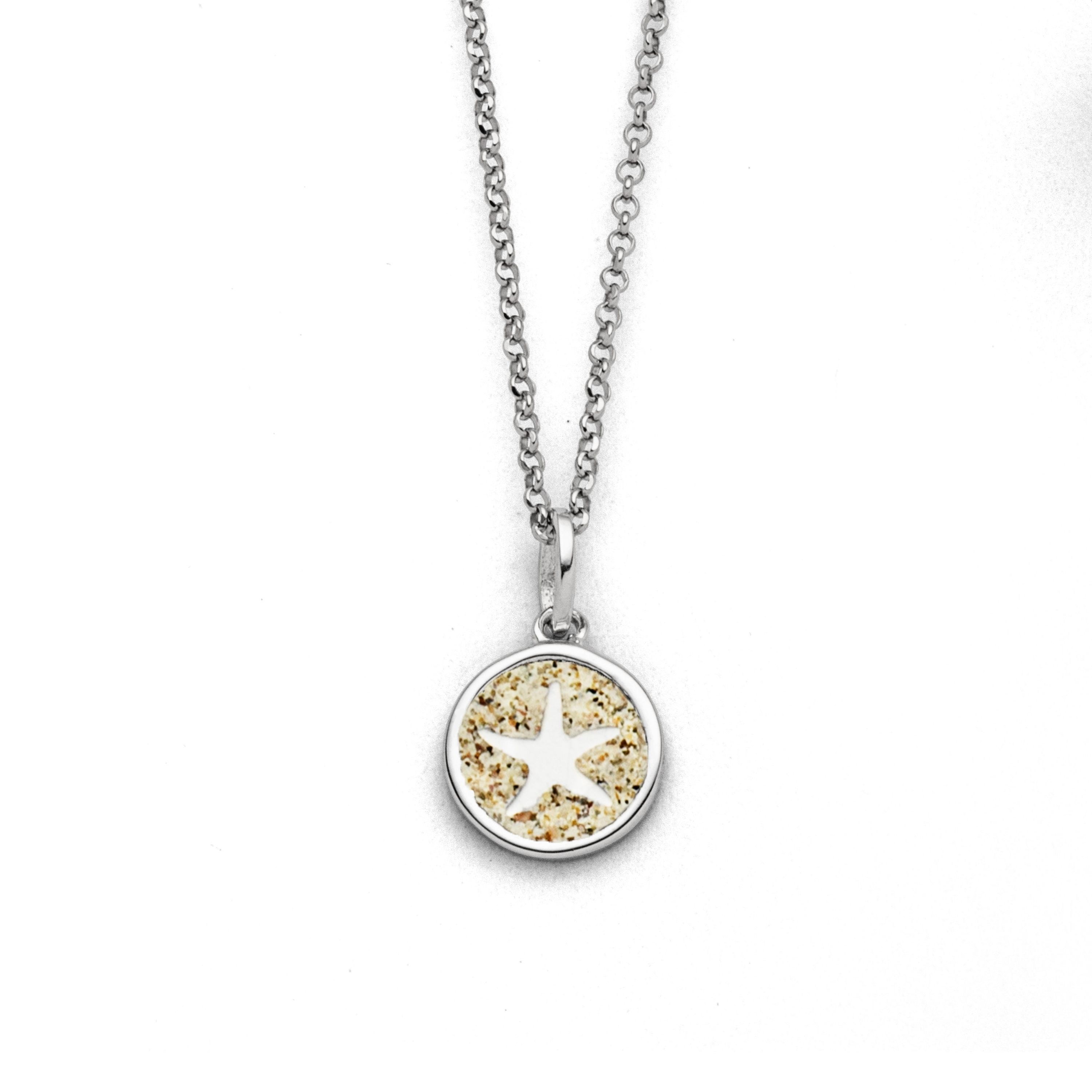Ring "Seestern", mit einem Seestern als Motiv, eingebettet in Strandsand, gefaßt in rhodiniertem 925er Sterlingsilber.