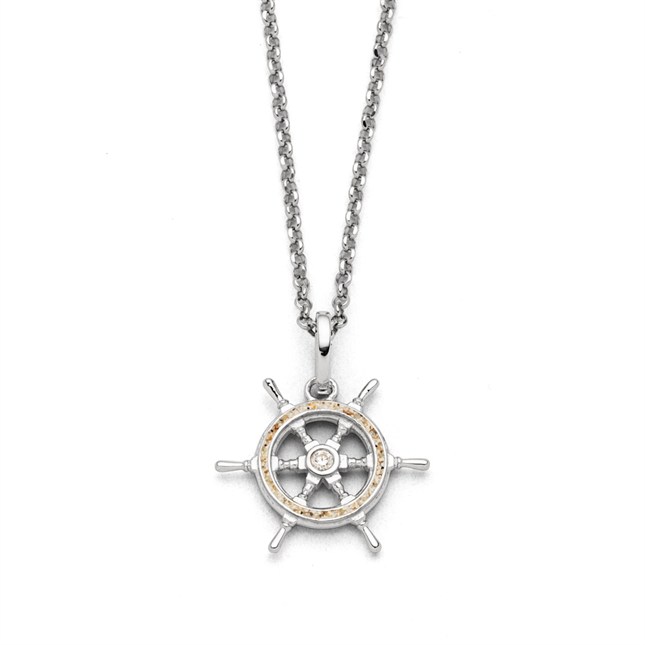 Echte Sehnsucht: Charm in Form eines Steuerrads, der äußere Ring gefüllt mit Strandsand und einem mittig eingefassten Zirkoniastein, alles aus poliertem und rhodiniertem 925er Sterling-Silber. Zu kombinieren mit A 1134 in verschiedenen Längen.