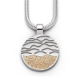 Die einmalige Küstenlandschaft der Nordsee ist in unserem aufwendigen Anhänger „Strandwellen“ auf künstlerische Weise eingefangen. Diese ganz besondere maritime Lebenswelt ist geprägt vom ständigen Wandel. Meer und Strand, Wasser und Land. In unserem Anhänger werden die beiden Elemente vereint. Der runde Anhänger ist aus hochwertigem 925er Sterlingsilber gearbeitet. Das untere Drittel des Anhängers ist gefüllt mit unserem Strandsand. So wird eine unglaubliche Naturverbundenheit kreiert. Dieses Material stammt von echten Stränden und ist ein echtes Unikat! Oberhalb des natürlichen Sandes ist ein kunstvolles Geflecht aus feinen Silberlinien gearbeitet. Es stellt das betörende Spiel der Wellen dar. Geschwungene Linien in Wellenform berühren sich, stapeln sich scheinbar und kreieren somit Ihren ganz persönlichen Ozean. Das Beste aus beiden Welten aber auch zwei sich wundervoll ergänzende Materialien treffen in unserem Anhänger zusammen. Ein Muss für jeden Meeresliebhaber!