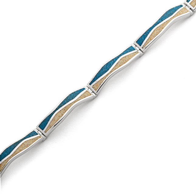 Halbcreole "Welle 2.0", eine Hälfte mit Strandsand und die andere mit blauem Steinsand gefüllt, getrennt durch eine Welle, alles aus rhodiniertem 925er Sterling-Silber. Durch die Rhodinierung ist das Schmuckstück anlaufgeschützt.