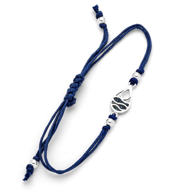 Cotton-Armband blau "Strandwellen" Drop, die Wellen sind mit Mosaik Seeopal gefüllt. Rechts und links neben dem Element befinden sich noch 4 mm Silberkugeln, sowie auch an den Enden, längenverstellbar 925er Sterling-Silber