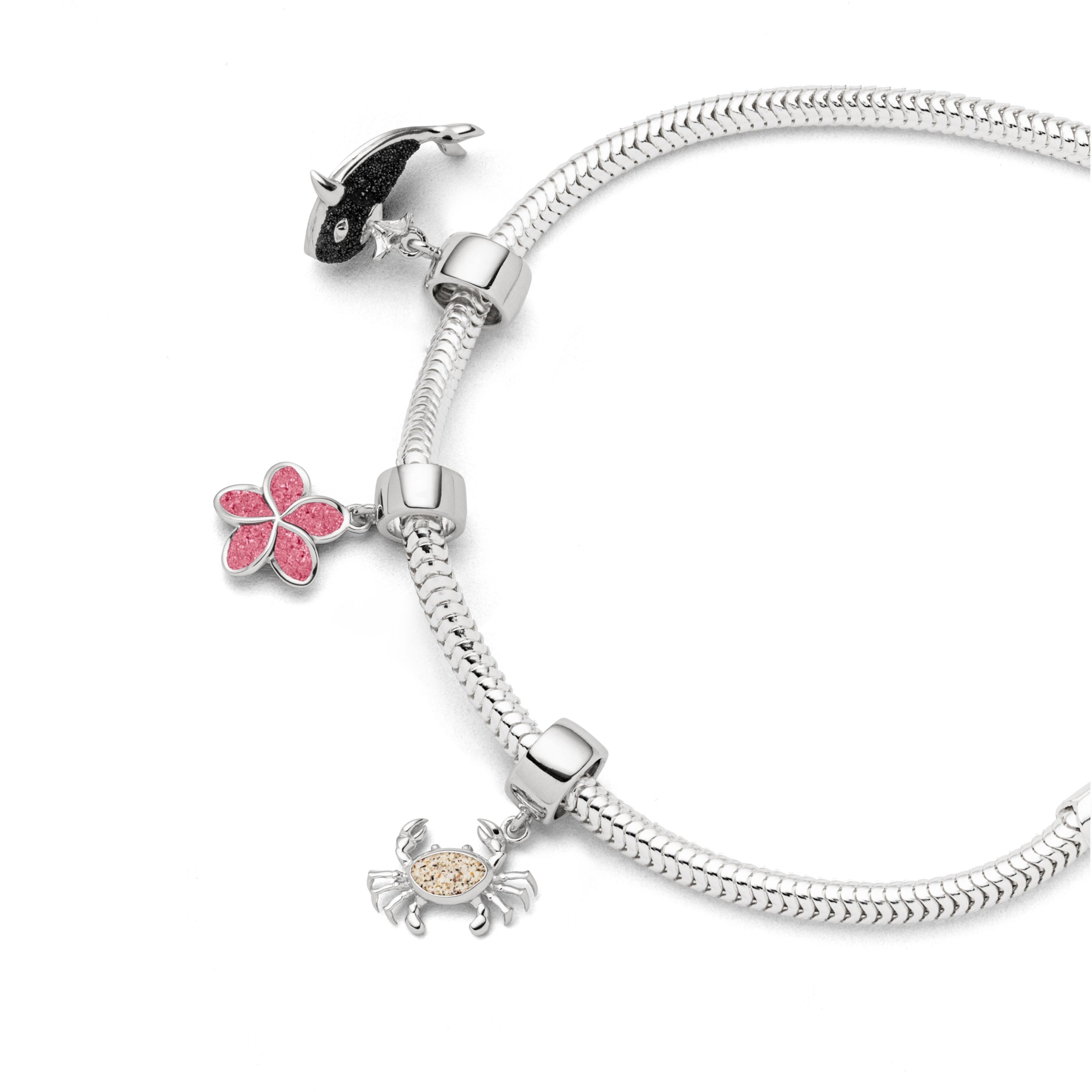 Unsere modernen Charms sind Schmuckstücke, die Sie mit Ihrer Persönlichkeit spielen lassen. Ganz gleich, ob Sie einzelne Charms am passenden Armband A 1134 tragen oder gleich mehrere aussagekräftige Charms kombinieren: im Vordergrund stehen Ihre Vorlieben. Hochwertige Materialien treffen auf maritime Symbolik und lassen Sie strahlen! Der zeitlose Charm „Plumeria Blüte“ ist formschön und plastisch gearbeitet. So lässt sein Anblick Sie augenblicklich an liebgewonnene Erinnerungen am Meer denken. Träumen Sie von Wärme, exotischem Flair und fernen Stränden. Einfach wunderschön. Liebvolle Details lassen das hochwertige Schmuckstück besonders echt wirken. Auch die Farbgebung und Materialien sind echte Highlights: edles Silber trifft auf rosa Steinsand. Ein Fest für die Augen! Strahlen Sie ebenso wie die wunderschöne Blüte.