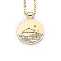 Anhänger Strandwellen "Fanø" Strandsand/blauer Steinsand P4371 Runder Anhänger Strandwellen "Fanø" mit dem Motiven: -Möwe-Segelschiff-Inselsilhouette, die Wellen sind eingebettet in Strandsand und blauem Steinsand (Kyanit), alles gefasst in poliertem, rhodiniertem 925er Sterling-Silber.
