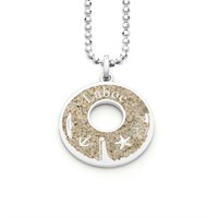 Anhänger "Ameland" P3462 Runder Anhänger "Ameland" mit den Symbolen: Seehund - Inselsilhouette - Seestern - Rettungsboot mit Pferden - Leuchtturm, mit Kettenöse auf der Rückseite eingebettet in Strandsand von Ameland, gefasst in poliertem und rhodiniertem 925er Sterling-Silber