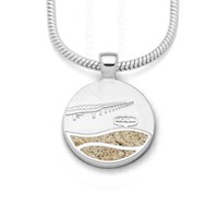 Anhänger Strandwellen "Vlieland" Strandsand P3891 Runder Anhänger Strandwellen "Vlieland" mit dem Motiv: - Drenkelingenhuisje - , die Wellen sind eingebettet in Strandsand von Vlieland, alles gefasst in poliertem , rhodiniertem 925er Sterling-Silber.