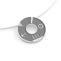 Anhänger "Hamburg" Strandsand P4224 Runder Anhänger "Hamburg" mit einer Kompassrose und den Motiven Rathaus, Kreuzfahrtschiff, Hafenkräne, Elphi, Segler + 2 Möwen, Anker, eingebettet in Strandsand und gefasst in rhodiniertem poliertem 925er Sterling-Silber.