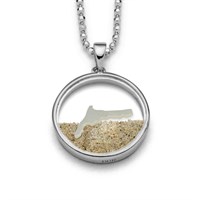 Anhänger Strandwellen "Fischland Darß" Strandsand P4515 Runder Anhänger Strandwellen "Fischland Darß" mit dem Motiv: Inselsilhouette "Fischland Darß", die Welle ist eingebettet in Strandsand, alles gefasst in poliertem, rhodiniertem 925er Sterling-Silber.