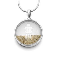 Anhänger Strandwellen "Darßer Leuchtturm/Windflüchter" 15 mm, Strandsand und Bernsteinsand P4637 Kleiner runder Anhänger 15 mm Strandwellen Anhänger mit den Wunschmotiven: - Darßer Leuchtturm - Windflüchter -, die Wellen sind mit Strandsand und Bernsteinsand gefüllt. Alles gefasst in poliertem, rhodiniertem 925er Sterling-Silber.
