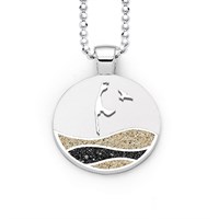 Anhänger Strandwellen "Sylt" Strandsand/Steinsand P3930 Runder Anhänger Strandwellen "Sylt" mit dem Motiv: Inselsilhouette und Möwe, die Wellen sind abwechselnd eingebettet in Strandsand und blauem Steinsand, alles gefasst in poliertem, rhodiniertem 925er Sterling-Silber.