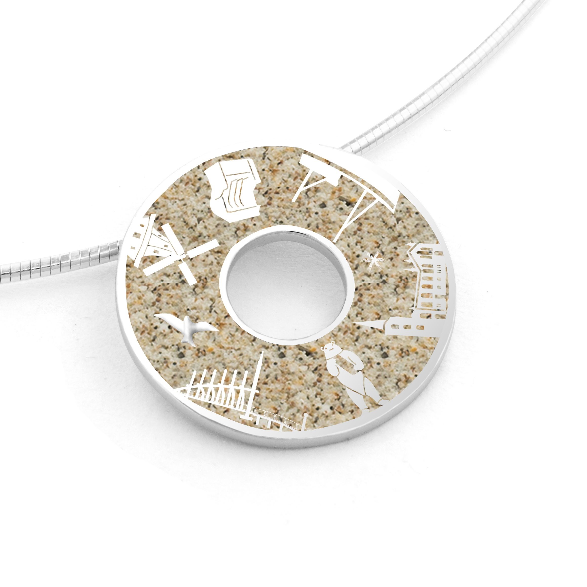 Runder Anhänger "Donut Esens" mit den bekannten Symbolen der Stadt: Mühle-Möwe-Brücke-Bär-St.Magnus Kirche-Kutter und Strandkorb , mit Kettenöse auf der Rückseite eingebettet in Strandsand, gefasst in poliertem und rhodiniertem 925er Sterling-Silber