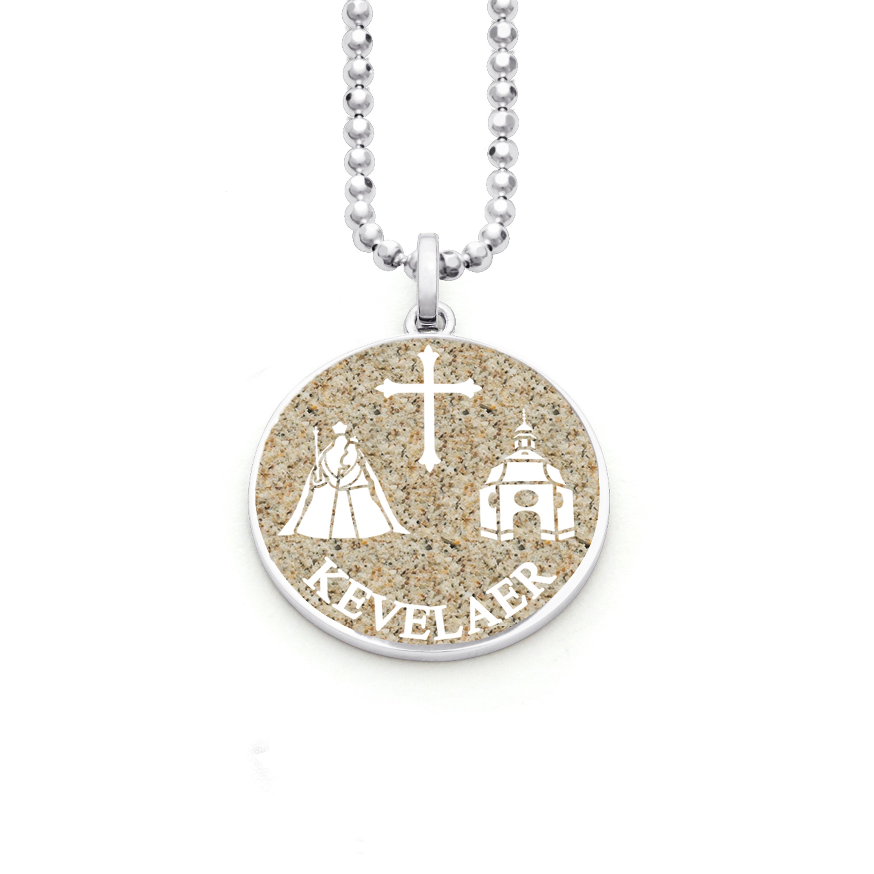 Runder Anhänger "Kevelaer" mit den Motiven: Heilige Maria - Kreuz - Kapelle, , eingebettet in Strandsand und gefasst in poliertem 925er Sterling-Silber.