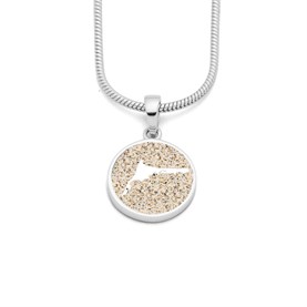Anhänger "Fischland", kleiner runder Anhänger mit derFischland-Darß Silhouette, in Strandsand eingebettet und gefaßt in rhodiniertem 925er Silber
