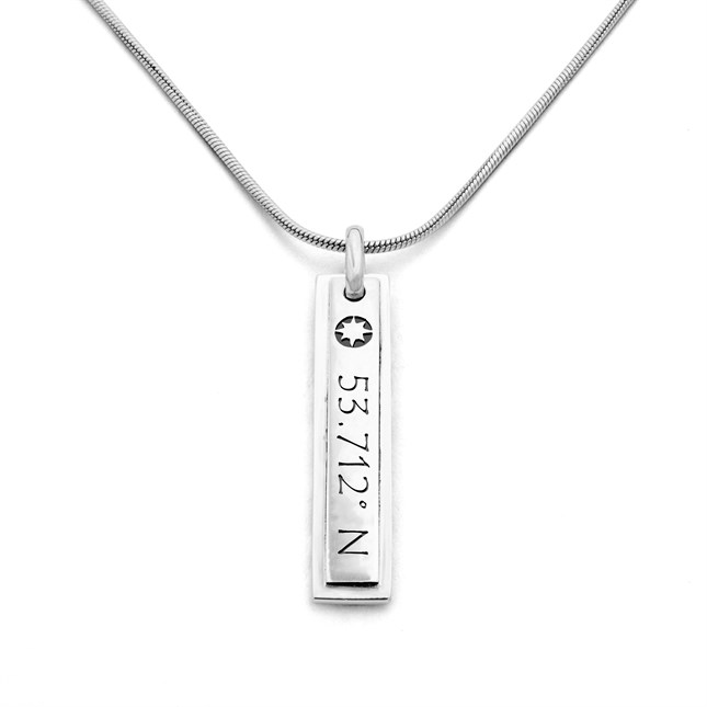 Länglicher Anhänger mit den Koordinaten von "Norderney" beidseitig, aus 925er Sterling-Silber.