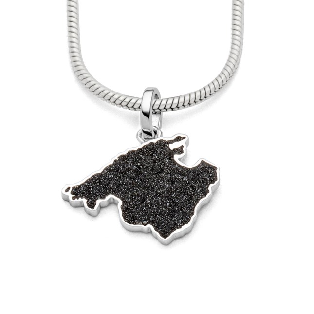 Anhänger "Mallorca" als Inselsilhouette, gefüllt mit Lavasand und gefasst in rhodiniertem 925er Sterling-Silber.