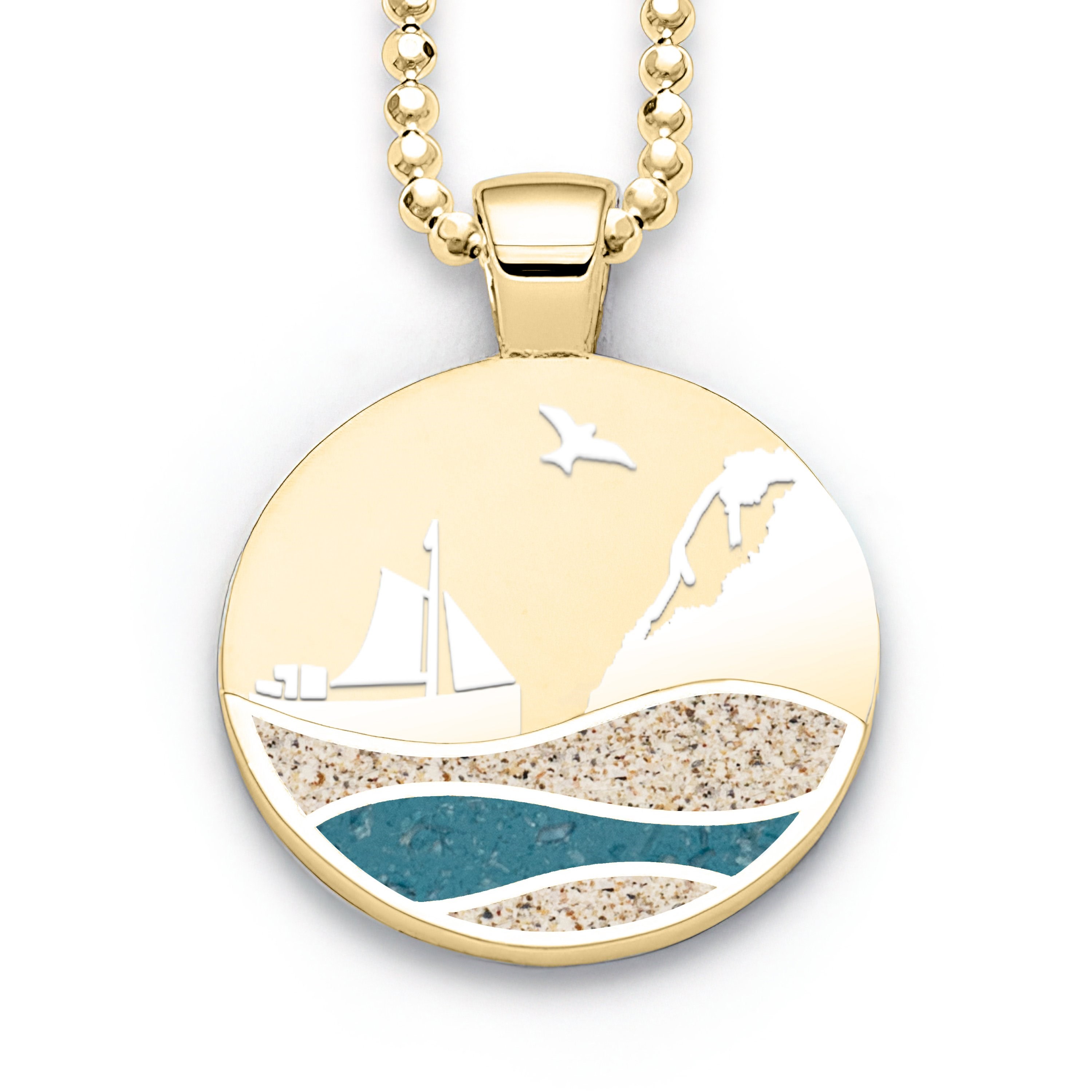 Runder Anhänger Strandwellen "Göhren" mit den Motiven: Museumsschiff „Luise“, Kreidefelsen „Steilküste“, Möwe, die Wellen sind abwechselnd eingebettet in Strandsand und blauem Steinsand, alles gefasst in poliertem , vergoldetem 925er Sterling-Silber.