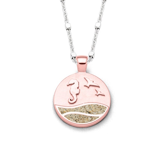 Kleiner runder Anhänger 15 mm Strandwellen "Timmendorf" mit den Motiven: -Seepferdchen-zwei Möwen- die Wellen sind mit Strandsand gefüllt und auf der Rückseite befinden sich die Koordinaten der "Seebrücke Timmendorf" 54°00’04.4”N 10°47’00.7”E. Alles gefasst in poliertem, rosé vergoldetem 925er Sterling-Silber.