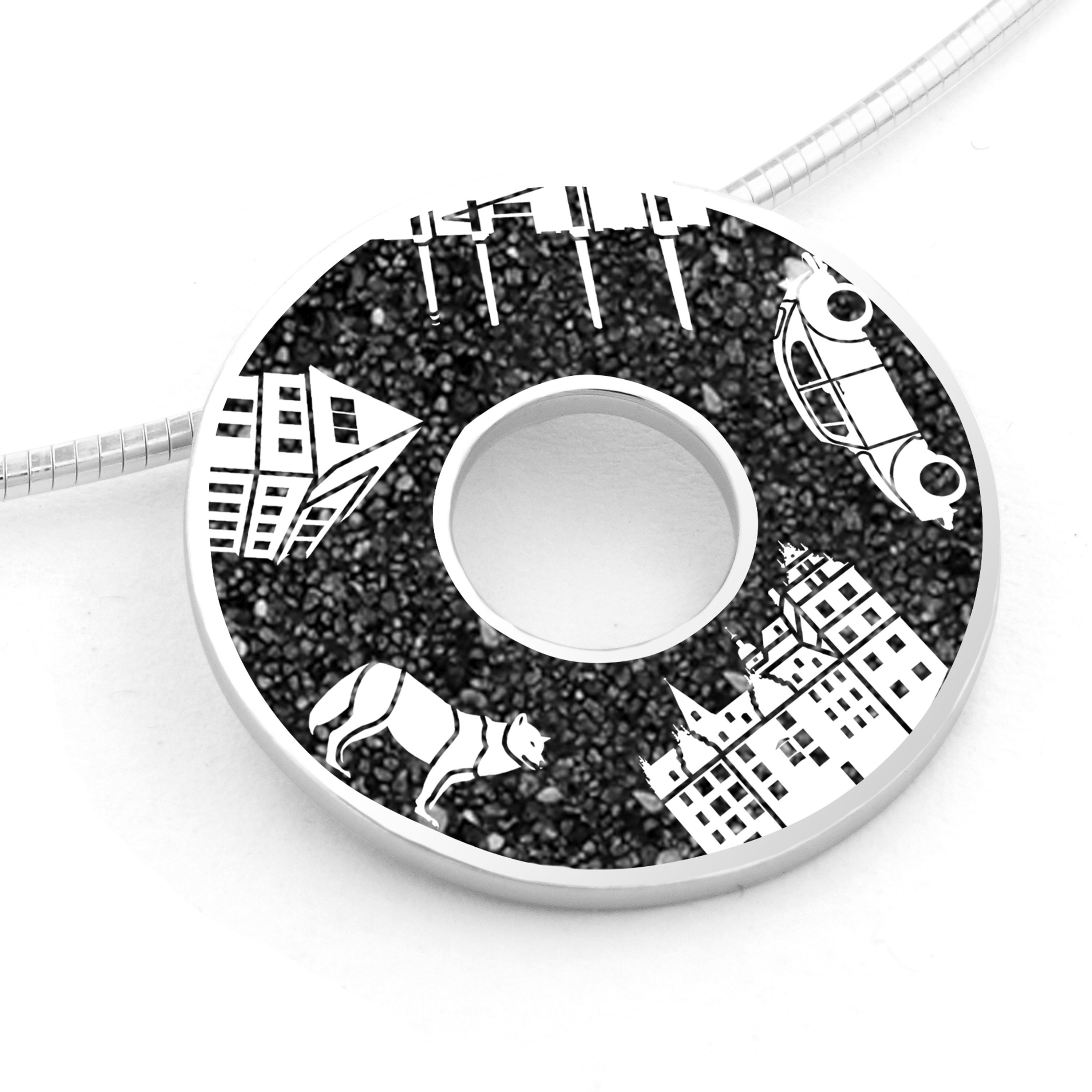 Runder Anhänger "Wolfsburg" mit den bekannten Symbolen der Stadt:Haus Hoffmann - Wolf - Schloss Wolfsburg - VW Käfer - VW Werk, mit Kettenöse auf der Rückseite eingebettet in Lavasand, gefasst in poliertem und rhodiniertem 925er Sterling-Silber