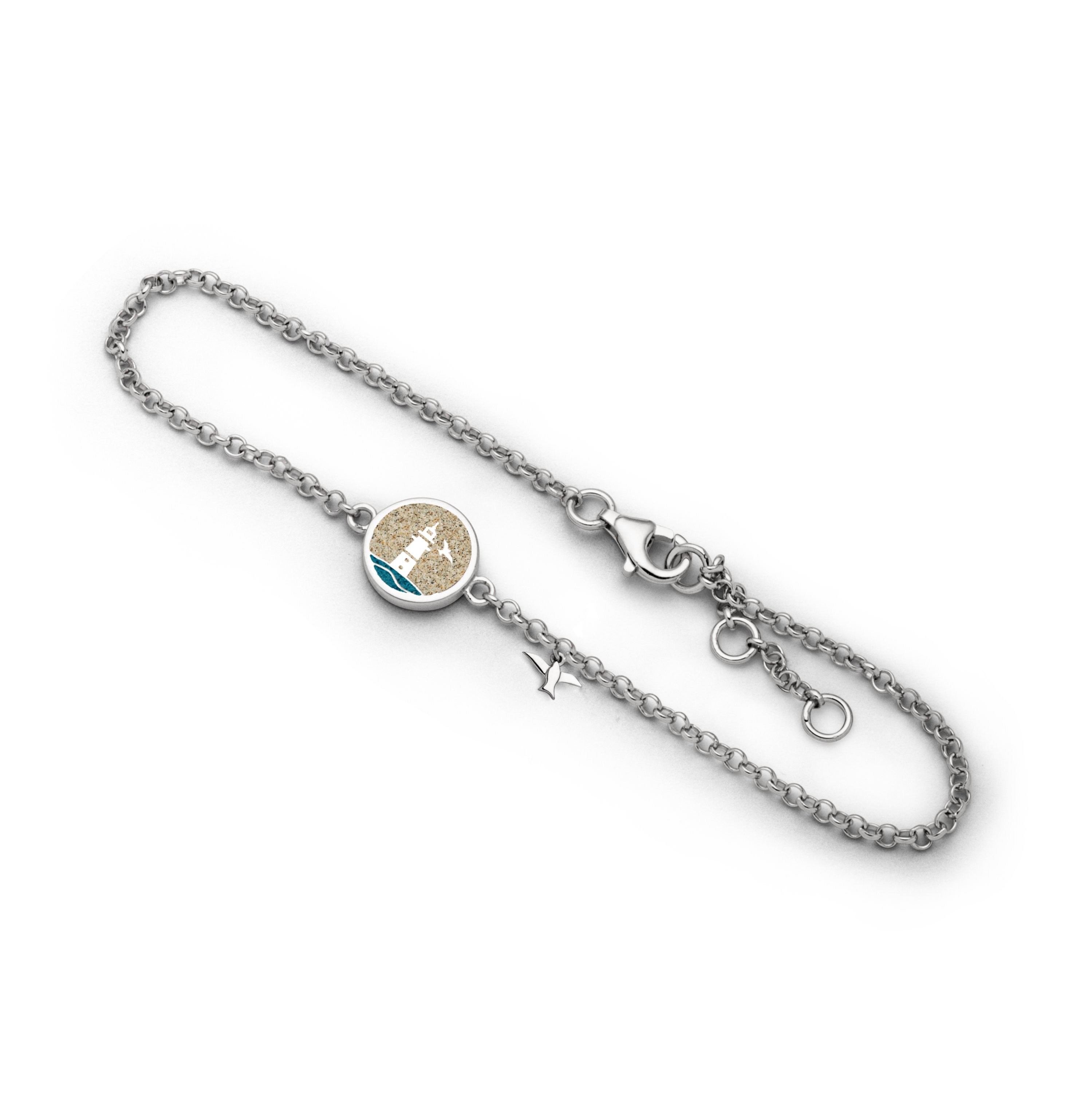 Unser feingliedriges Armband ist die perfekte Begleitung für Ihren Alltag! Das Armband verfügt über eine Länge von 16,5 cm plus zwei mögliche Verlängerungen von jeweils 1 cm. In der Mitte des Armbands befindet sich das Highlight - das runde Emblem gefüllt mit der einzigartigen Küstenlandschaft. Das runde Emblem ist aus edlem 925er Sterlingsilber gearbeitet. Dieses ist rhodiniert und somit anlaufgeschützt. Während das untere Drittel des Emblems gefüllt ist mit naturbelassen rauem Strandsand, erstreckt sich auf den oberen zwei Dritteln ein feines Geflecht aus geschwungenen Silberlinien. Zahlreiche Wellen scheinen sich seicht am Strand zu brechen. Die wellenförmigen Silberlinien sind poliert und grenzen sich damit stilvoll vom Strandsand aber auch von der matten Unterfläche ab. Das Emblem hat eine Breite von 10 mm. Mit einem Gewicht von 3 Gramm ist unser Armband der perfekte Begleiter durch Ihren Alltag!