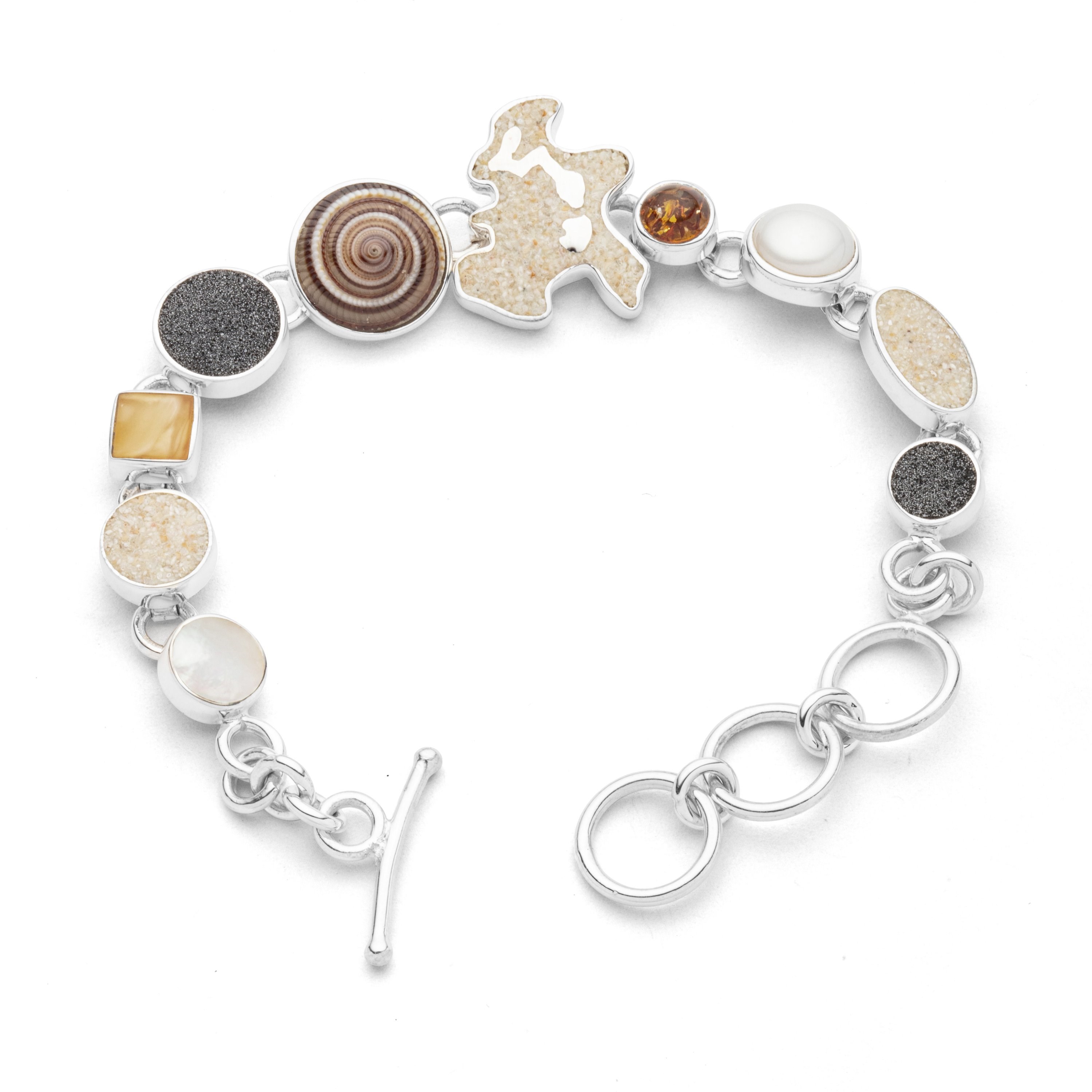 Maritimes Armband Strandrausch "Rügen" mit verschieden geformten Elementen, gefüllt mit Lavasand, Muschel, Perle, Bernstein, Strandsand und Spiral brown, in der Mitte befindet sich die Inselsilhouette mit kleinem Jasmunder Bodden gefüllt mit Strandsand, alles gefasst in 925er Sterling-Silber, ca. 15,5 cm lang + 3 cm Verlängerung