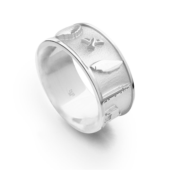 Bandring "Texel" mit den Motiven: Robbe - Muschel - Möwe - Inselsilhouette - Seuchtturm - Schaf - Schaapenboet , innen leicht mattiert, alles aus rhodiniertem 925er Sterling-Silber.