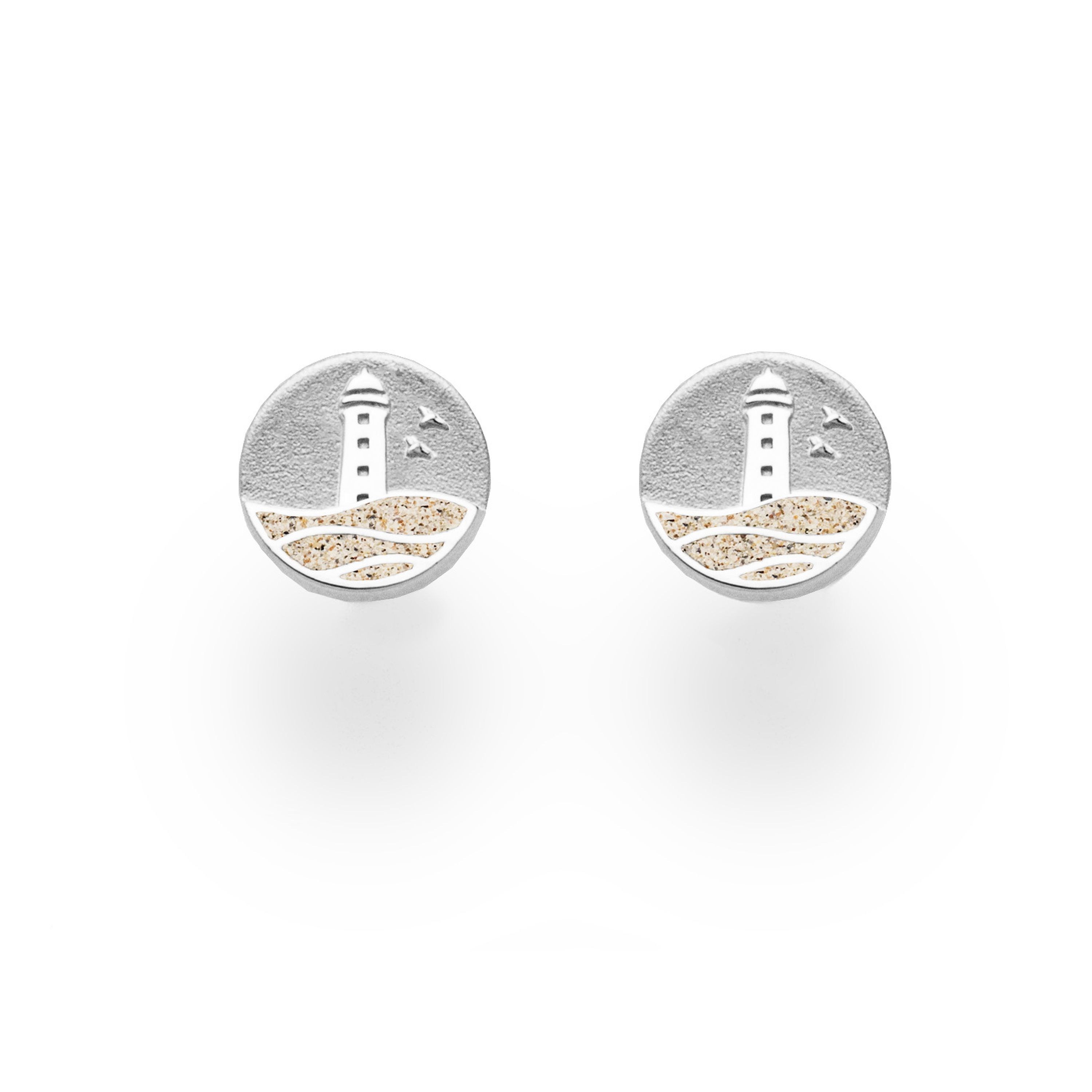 Kleiner runder Ohrstecker 10 mm Strandwellen "Cuxhaven" mit den Wunschmotiven: -Leuchtturm und zwei Möwen-, auf sandgestrahltem Hintergrund, die Wellen sind mit Strandsand gefüllt. Alles gefasst in poliertem, rhodiniertem 925er Sterling-Silber.