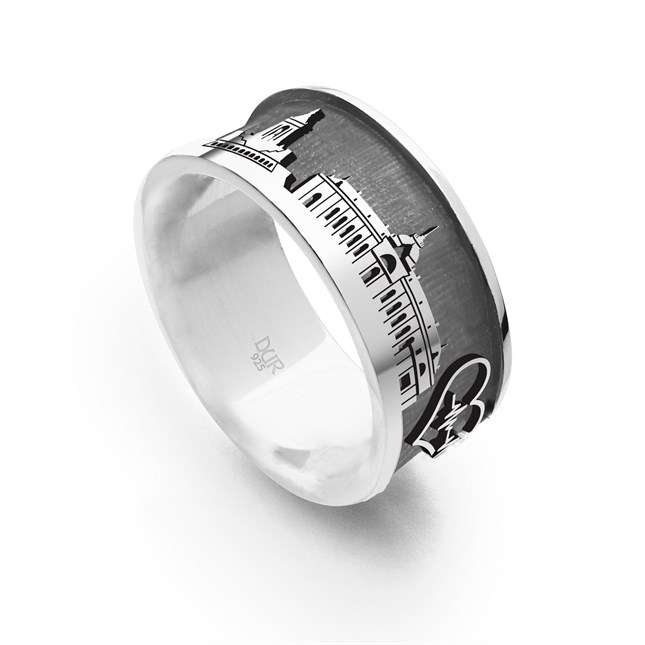 Bandring "Bad Oeynhausen" Premiumausführung mit dem silbernen Motiven: Wappen - Kaiser-Wilhelm-Denkmal - Kurhaus - Herz - Sueltemeyer-Brunnen, innen dunkel rhodiniert, alles aus rhodiniertem 925er Sterling-Silber.