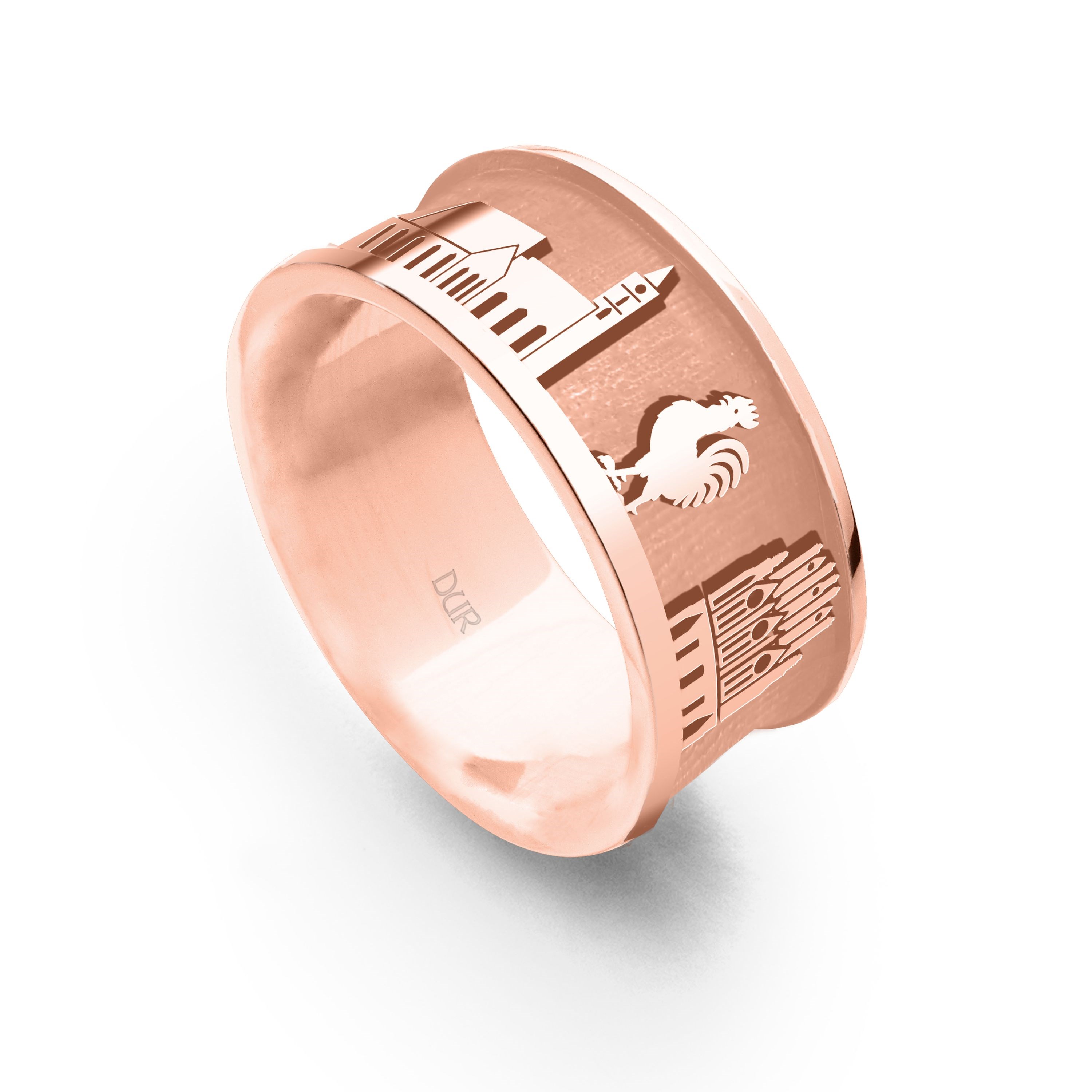 Bandring "Frankfurt Oder" Premiumausführung mit dem silbernen Motiven: Oder Turm - St. Marienkirche - Hahn - Rathaus - Brücke , aus 585/- Rosegold