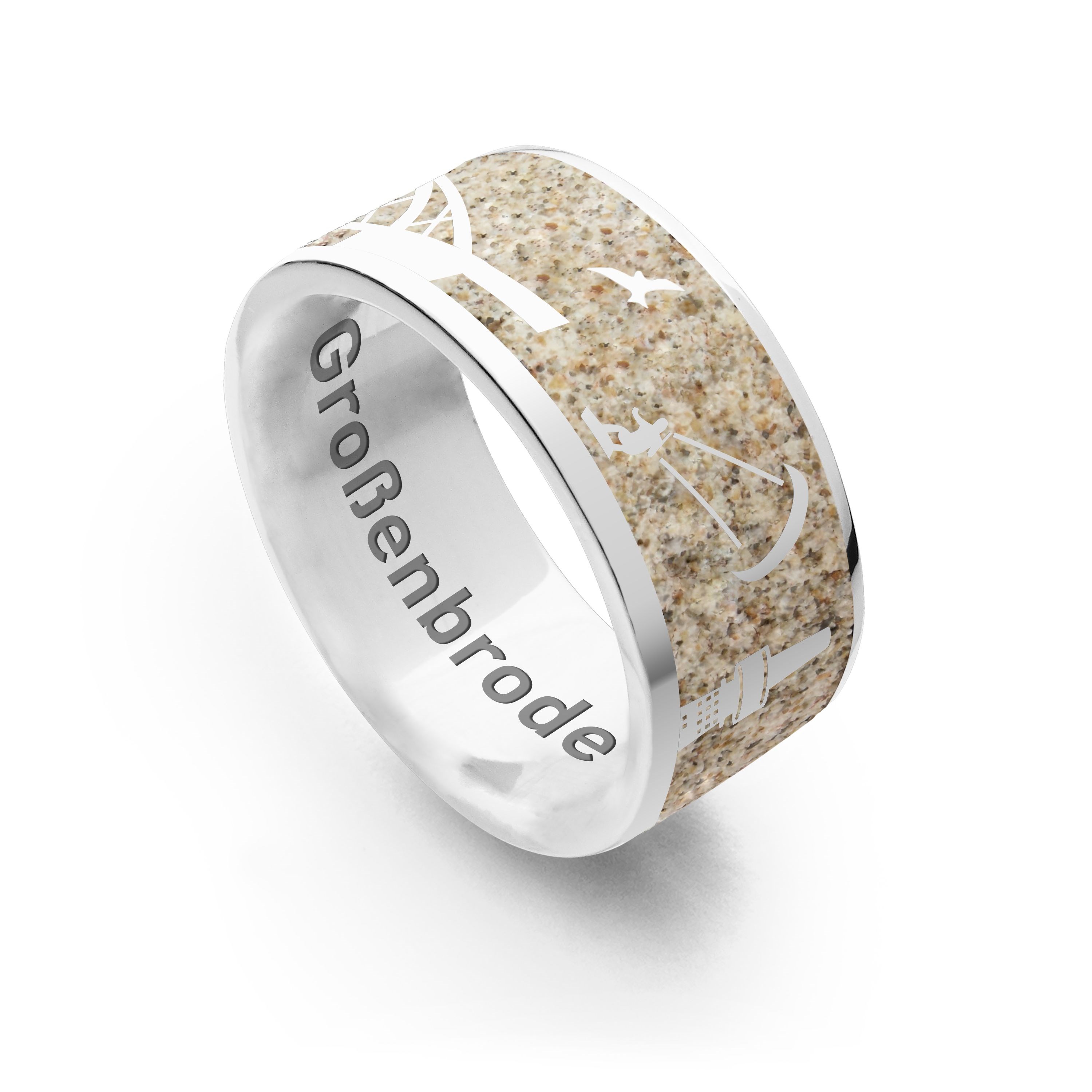 Strandsandring "Großenbrode" mit den silbernen Motiven: -Kirche Großenbrode ,möwe, Fehmarn-Sund-Brücke, möwe, Kiter, Turm der Erlebniswelt Großenbrode-, eingebettet in Strandsand und gefasst in rhodiniertem 925er Sterling-Silber.