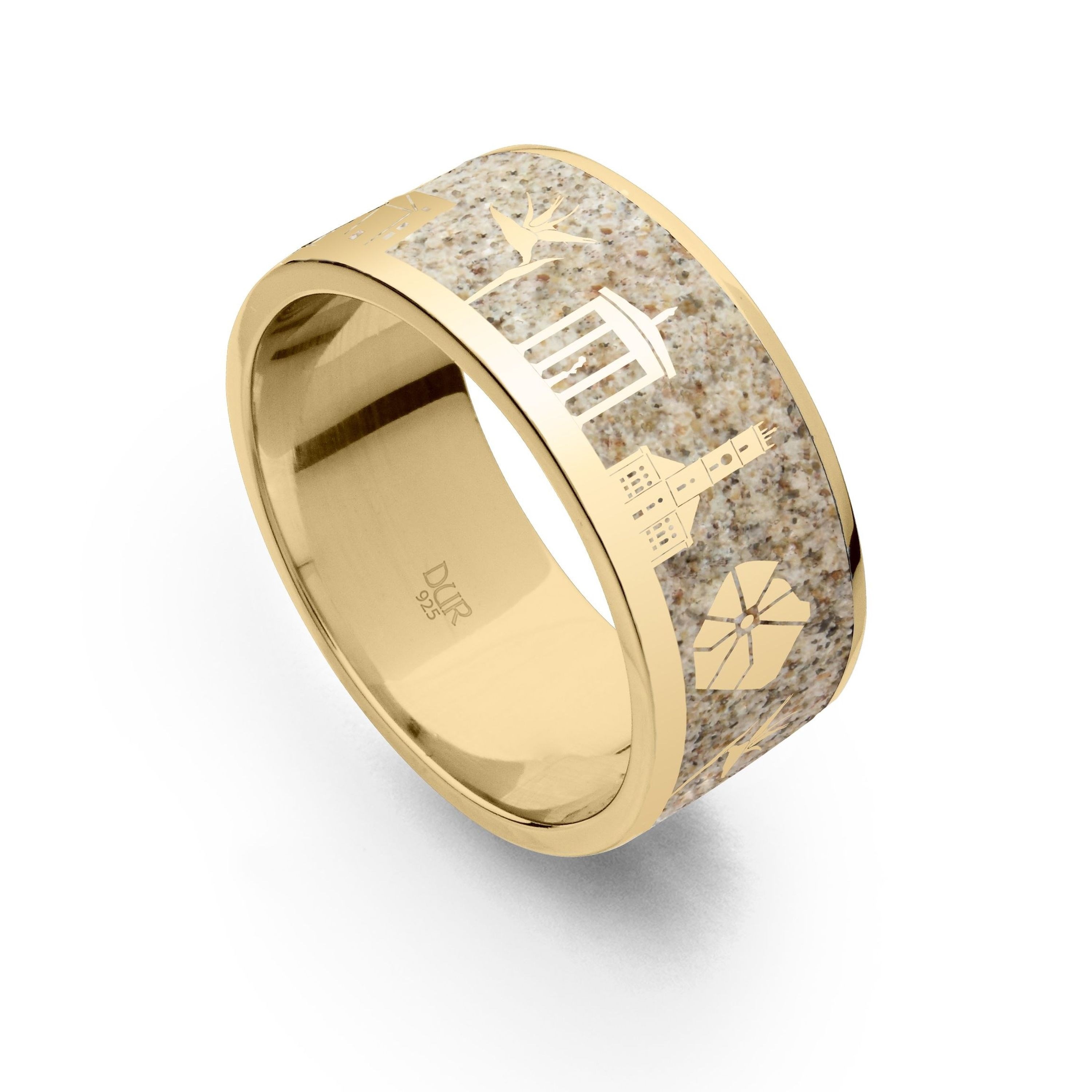 Strandring "Neustrelitz" Premiumausführung mit den Motiven: (Theater-Strelitzie-Hebetempel-Stadtkirche-Stadtkern-Strelitzie-Schloßkirche), eingebettet in Strandsand und gefasst in vergoldetem 925er Sterlingsilber.