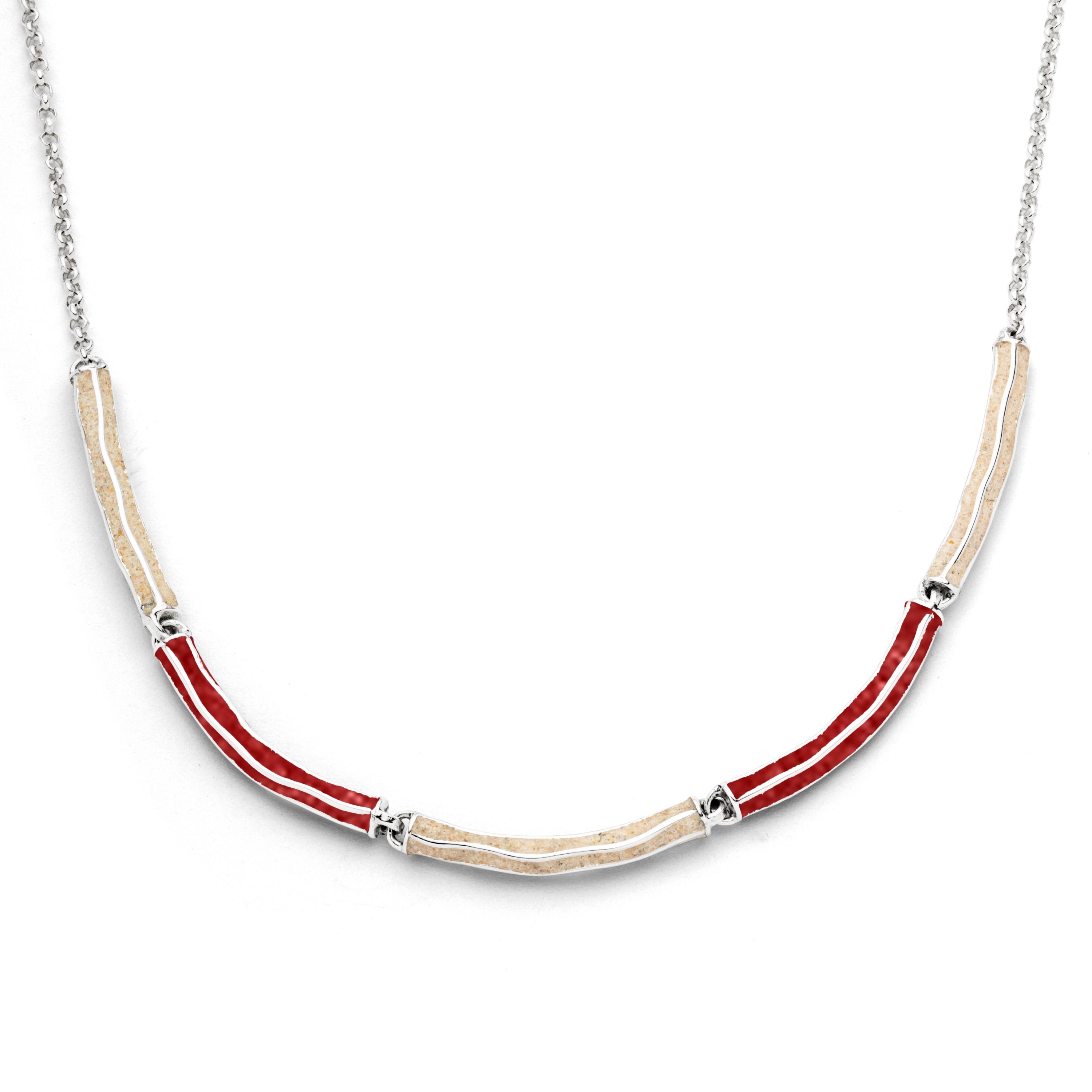 Handgefertigte Erbskette mit geschmeidigen, leicht geschwungenen Elementen, gefüllt mit Lavasand und Korallengranulat alles aus rhodiniertem 925er Sterlingsilber. Länge ca. 42 cm. + 3 cm Verlängerung. Durch das Rhodium ist das Schmuckstück anlaufgeschützt.