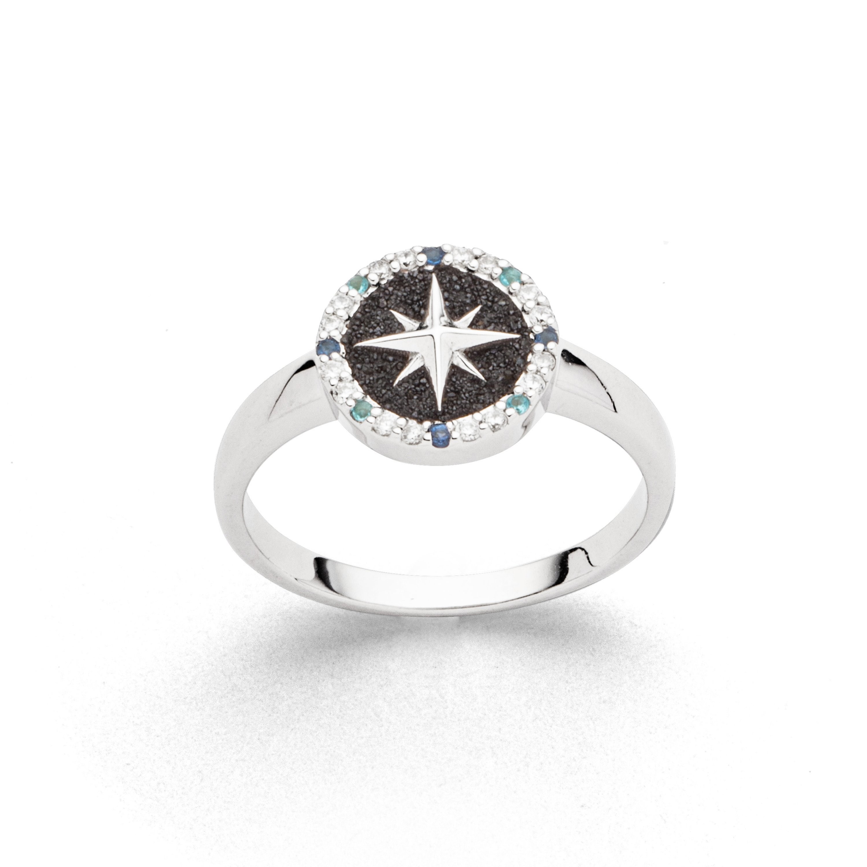 Runder Ring "Kompassrose 2.0" der äußere Rand ist mit Zirkoniasteinen in den Farben, weiß, hellblau und dunkelblau besetzt, innen mit Lavasand gefüllt, aus poliertem, rhodiniertem 925er Sterling-Silber