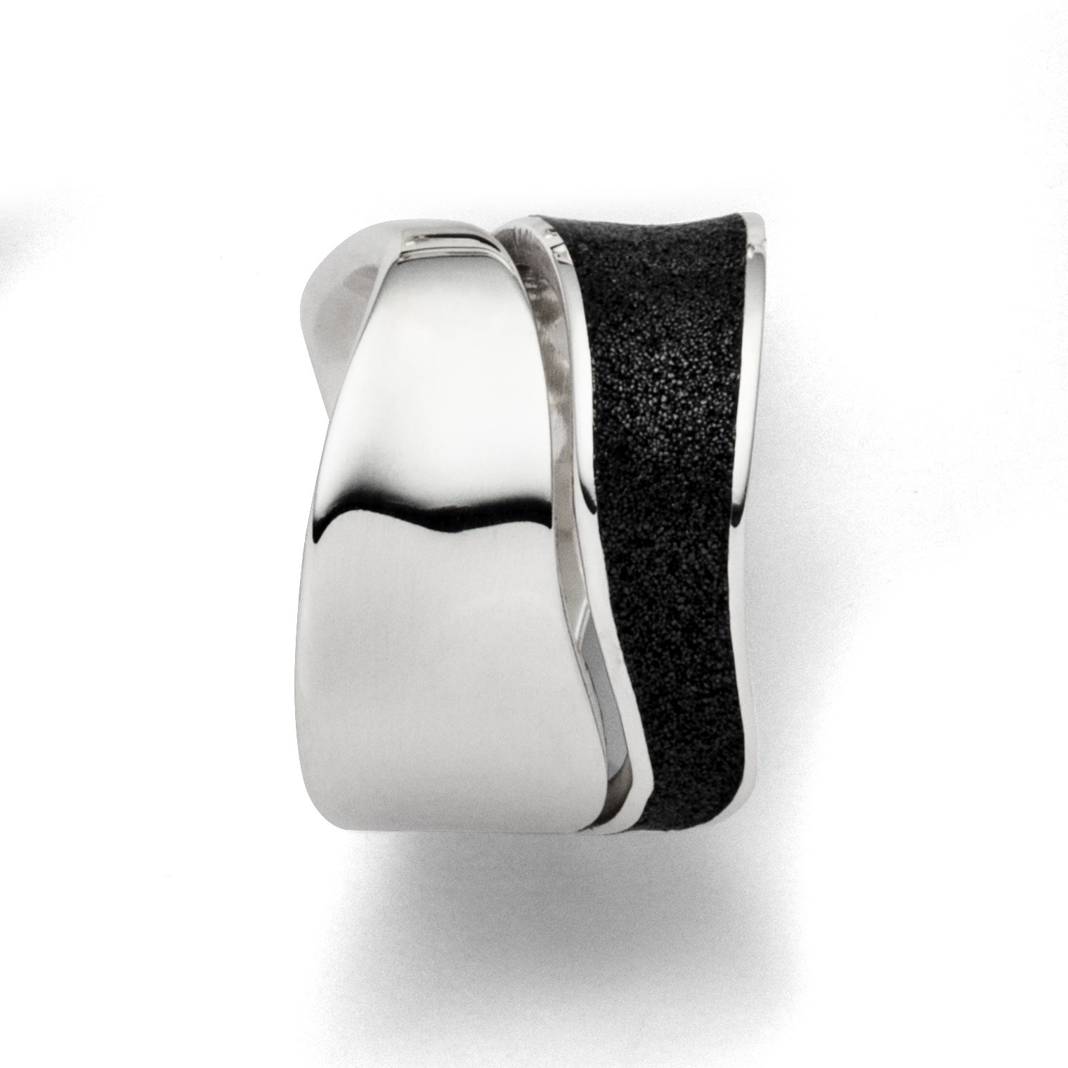 Breiter Bandring "Strandwellen", mit einem in Lavasand eingelegten Wellenmuster. Gefertigt aus poliertem und rhodiniertem 925er Sterling-Silber. Durch die Rhodinierung ist das Schmuckstück anlaufgeschützt.