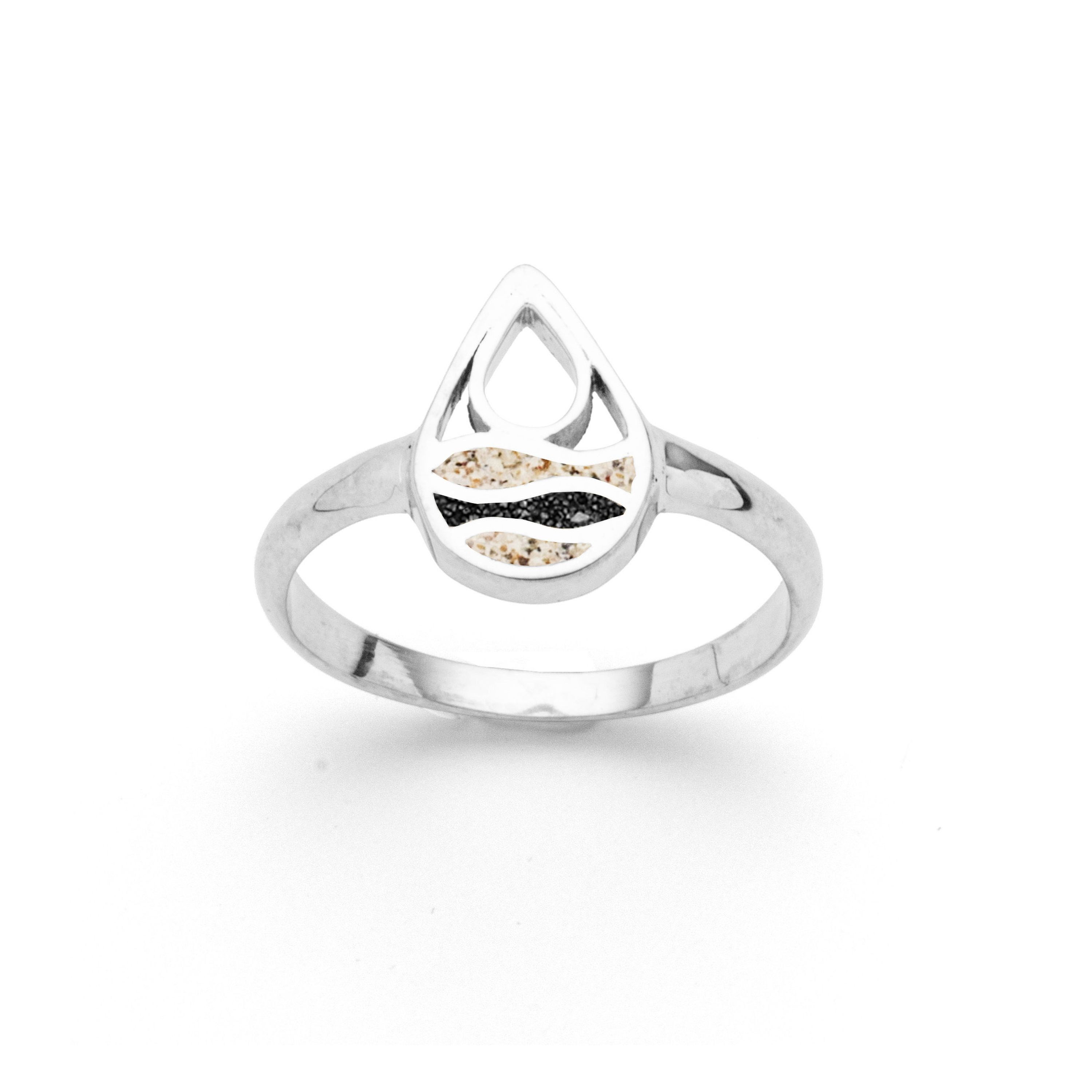 Schmaler, handgefertigter Ring mit einem Tropfen, die Wellen sind mit Strandsand und Lavasand gefüllt, alles aus rhodiniertem und poliertem 925er Sterlingsilber