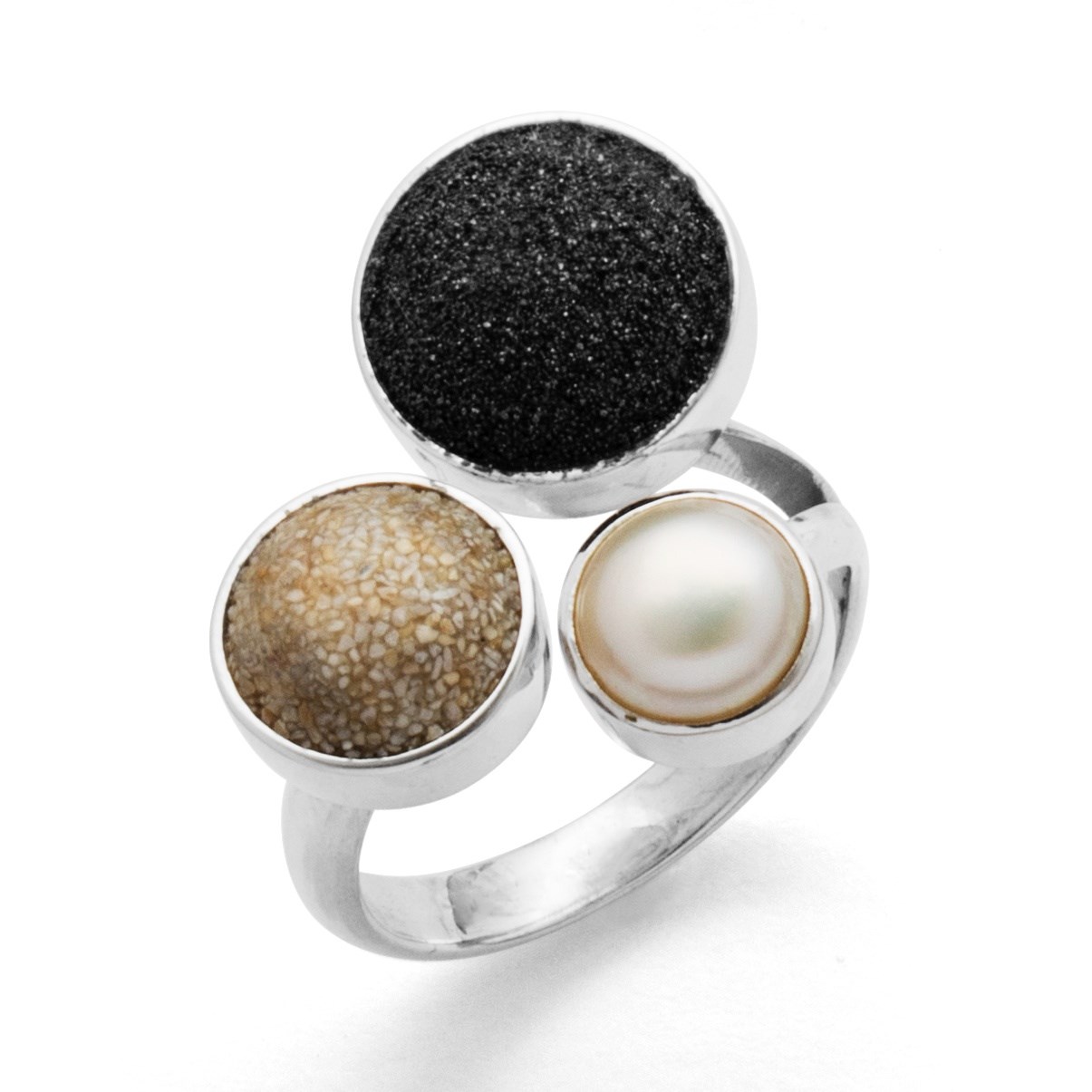 Ring "Treibsand 2.0" kombiniert aus drei flachen, runden, unterschiedlich großen Elementen mit Strandsand, Lavasand und Perlmutt, alles gefasst in 925er Sterling-Silber