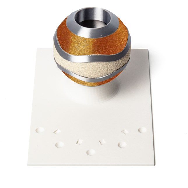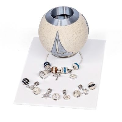 Display, weiß, für Schaufenster oder Vitrine, ideal zur Präsentation von Beads und Charms für Sammelarmbänder, mit 5 runden Einkerbungen zur sicheren Platzierung von Beads und 5 eckigen Einkerbungen für Charms, sowie einem integrierten Sockel mit großem Strandwellen Bead mit 2 silbernen Wellen, im Wechsel eingebettet in Bernsteinsand und Strandsand, Maße: 170x120x5mm. Gefertigt aus Polylactid (PLA), einem biobasierten Kunststoff, welcher aus nachwachsenden Rohstoffen wie Maisstärke oder Zuckerrohr besteht und biologisch abbaubar ist.