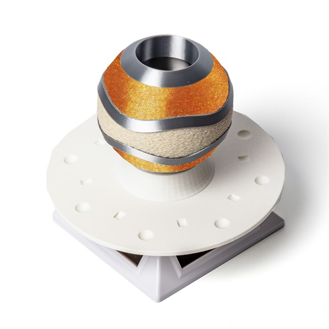 Rotierendes Solar-Display, (ohne Batterie) weiß, für Schaufenster oder Vitrine, ideal zur Präsentation von Beads und Charms für Sammelarmbänder, mit Platz für ein bestücktes Armband, 8 Beads und 8 Charms, sowie einem integrierten Sockel mit großem Strandwellen Bead mit 2 silbernen Wellen, im Wechsel eingebettet in Bernsteinsand und Strandsand, ca. 14-15 cm Durchmesser, 11 cm Höhe. Gefertigt aus Polylactid (PLA), einem biobasierten Kunststoff, welcher aus nachwachsenden Rohstoffen wie Maisstärke oder Zuckerrohr besteht und biologisch abbaubar ist.