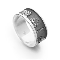 Ring "Wuppertal sandlos" dunkel rhodiniert R5525 Bandring "Wuppertal" Premiumausführung mit den silbernen Motiven: Wuppertaler Zoo, Schwebebahn, Fuchsvohwinkel, Schwebebahnüberbau Ohligsmühle und die Stadthalle, innen dunkel rhodiniert, alles aus rhodiniertem 925er Sterling-Silber.